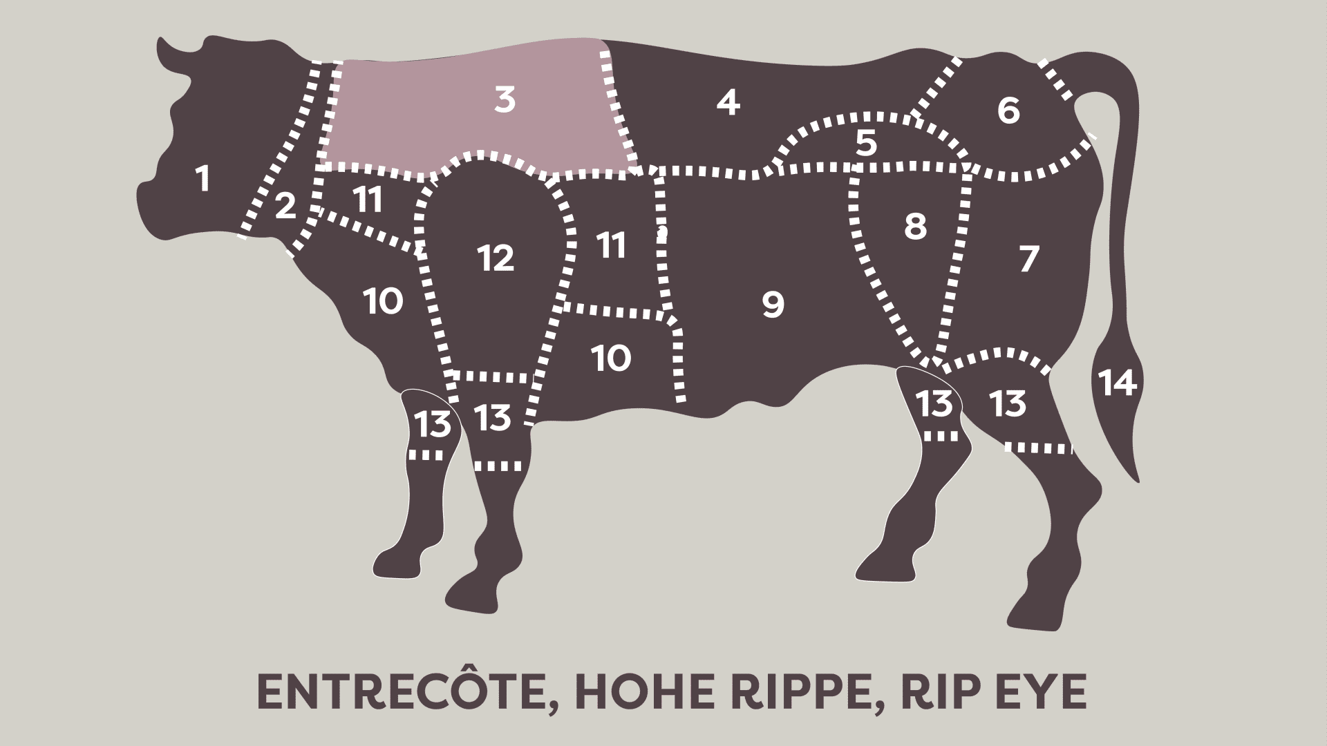 Die Präferenzen der Verbraucher sind sowohl regional als auch international unterschiedlich. Entweder man unterscheidet das Fleisch nach der Rasse des Rinds nach Alter und Geschlecht des Tieres oder nach den einzelnen Teilstücken. 1103 Hochrippe de Hohe Rippe de Schorrippe de Rundes Roastbeef de Rostbraten at Hohrücken ch Ribeye us Forerib uk Entrecôte fr 1109 Roastbeef de Beiried mit Rostbraten at Boneless striploin with forerib uk 1140 Hochrippendeckel de Rieddeckel at Hohrückendeckel ch Cap of.