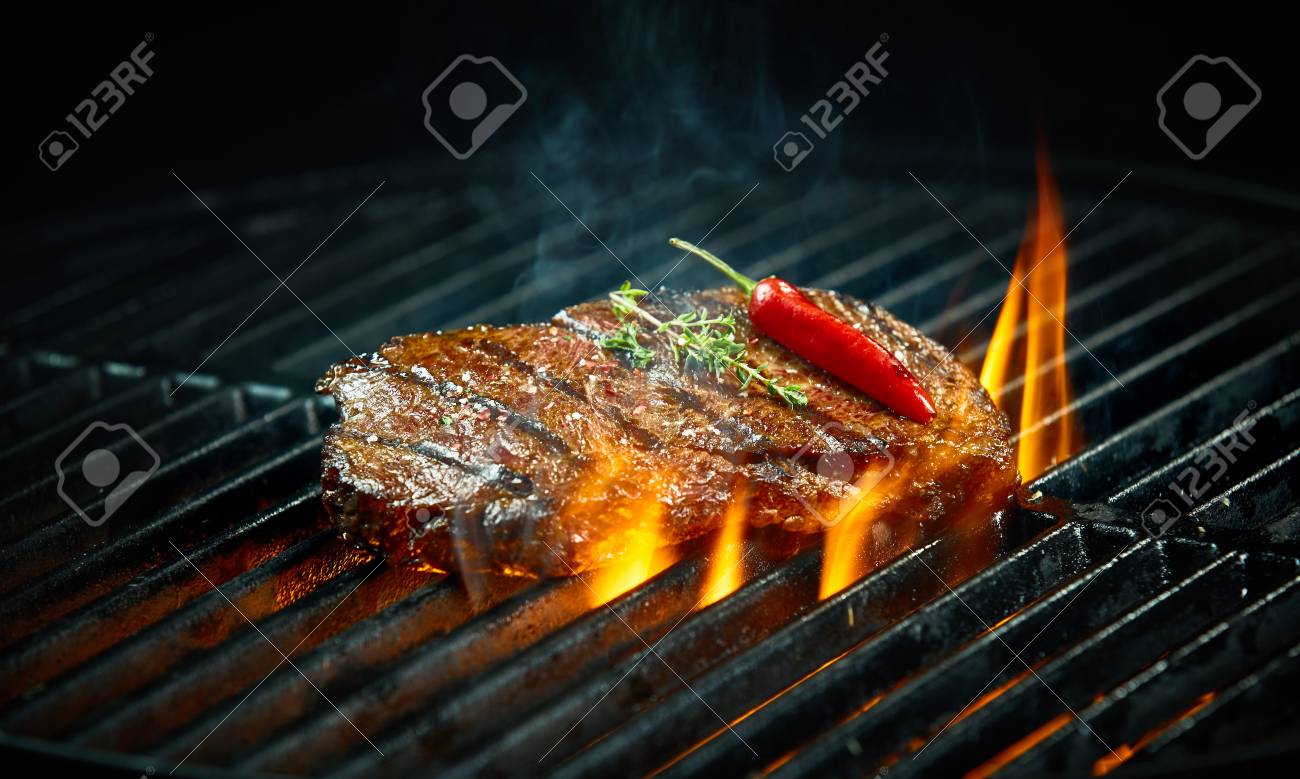 Heisses Scharfes Chili Steak Grillen Auf Einem Sommer Grill Uber Die Flammenden Heissen Kohlen Garniert Mit Einem Ganzen Roten Cayennepfeffer Und Frischen Rosmarin Lizenzfreie Fotos Bilder Und Stock Fotografie Image 73804901